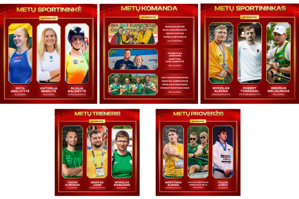 „Metų sportininko“ nominacijoje tarp trijų finalininkų pateko disko metikas Mykolas Alekna, kuris šiais metais iškovojo sidabro medalį pasaulio lengvosios atletikos čempionate ir 2025 m. sezono pradžioje pagerino planetos rekordą, taip pat Europos čempionu šiemet tapęs gimnastas Robertas Tvorogalas ir penktą vietą pasaulio čempionate užėmęs irkluotojas Giedrius Bieliauskas.